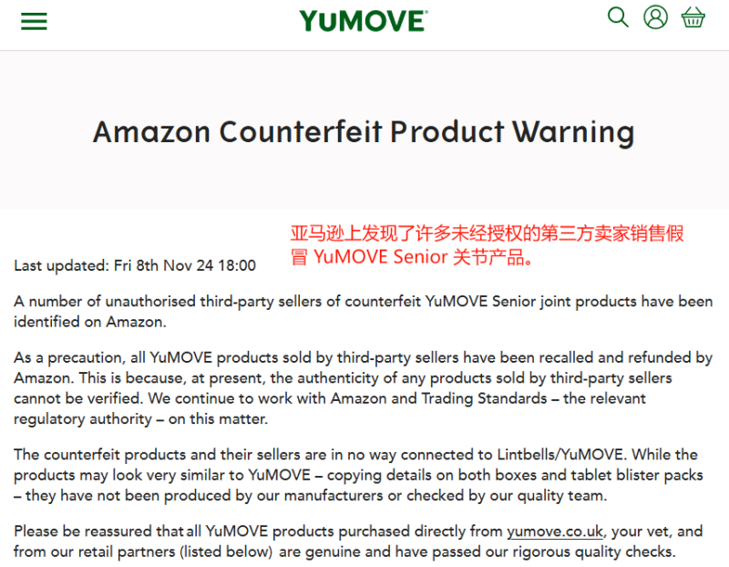 此前,亞馬遜宣布將召回并退款所有由第三方賣家銷售的YuMove產(chǎn)品,原因是平臺(tái)上出現(xiàn)了許多未經(jīng)授權(quán)的假冒YuMove Senior關(guān)節(jié)產(chǎn)品賣家,他們銷售的產(chǎn)品沒有經(jīng)過團(tuán)隊(duì)質(zhì)檢,安全難以保證。