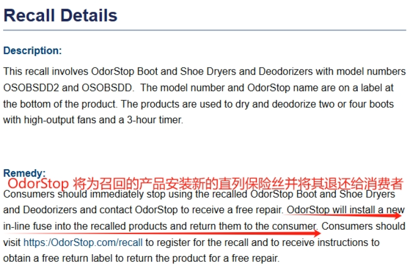 對(duì)于這款產(chǎn)品,CPSC建議消費(fèi)者立即停止使用,聯(lián)系OdorStop獲得免費(fèi)維修,并提議OdorStop在召回的設(shè)備中安裝新的直列保險(xiǎn)絲以減輕火災(zāi)隱患,并將承擔(dān)維修的運(yùn)費(fèi)。