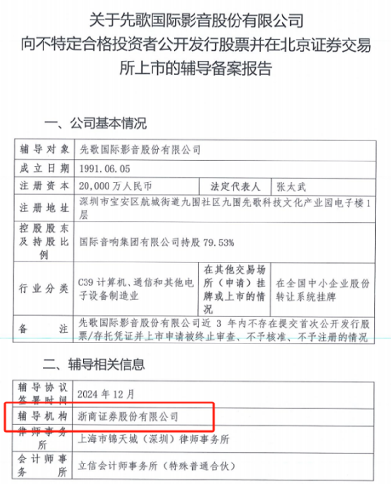 消息顯示,近日,深圳音響大賣先歌國際影音股份有限公司IAG GROUP LTD(以下簡稱“先歌國際”)已經在深圳證監局完成輔導備案,擬在北交所上市,輔導機構由東興證券變更為浙商證券。而2024年10月23日的時候,先歌國際才剛登陸新三板,現在又馬不停蹄地進入IPO預備狀態,上市步子邁得真是快。