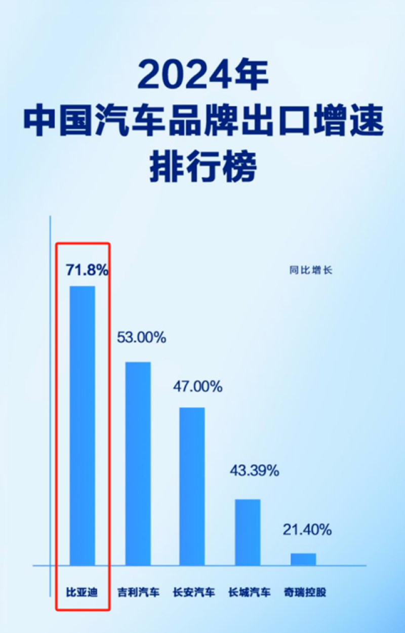 2024年,盡管面臨高額稅收和激烈競爭,比亞迪全年新能源乘用車出口量依然達到41.72萬輛,同比增長71.8%,成功打敗豐田、大眾,登頂全球新能源車銷量冠軍。
