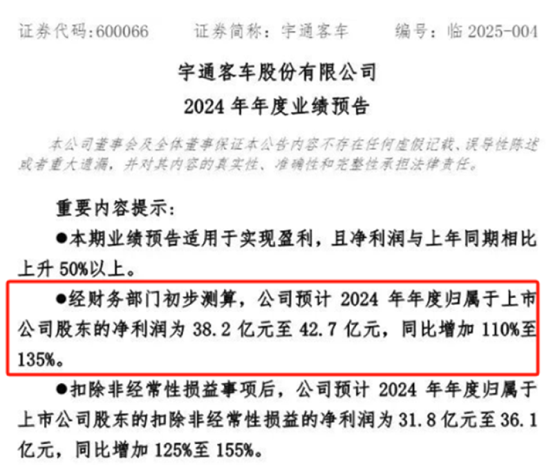 作為中國客車成功出海的典范,宇通客車的成績可謂相當亮眼,2024年,該公司累計出口客車(3.5米以上)高達1.4萬輛,同比大增37.7%。從整體業績上看,業績預報顯示,該公司2024年預計實現凈利潤38.32億元到42.7億,同比增加110%至135%。