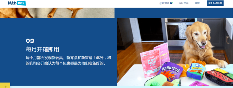值得一提的是,盲盒風潮還吹到了寵物界,專注寵物盲盒的品牌BarkBox每個月會給予訂閱用戶一個裝滿狗狗玩具、零食和保健品的大禮包,讓寵物主人省心省力的同時享受到拆盲盒的驚喜感。