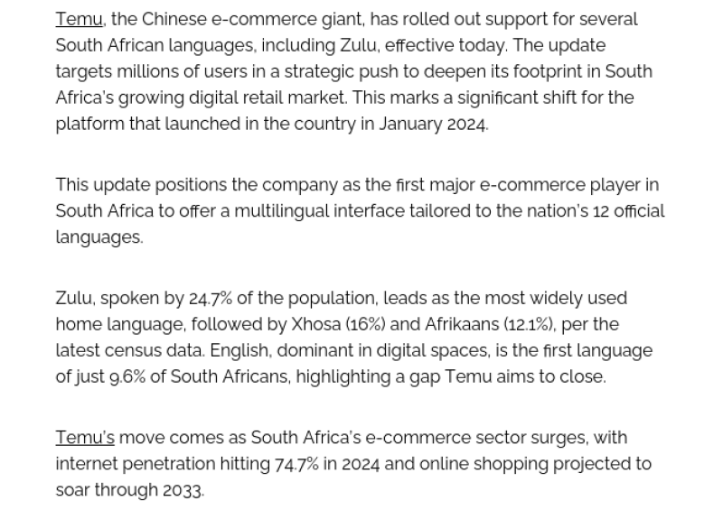 這一語(yǔ)言差距為T(mén)EMU提供了重要機(jī)會(huì),旨在通過(guò)增加本土語(yǔ)言支持填補(bǔ)這一空白,進(jìn)一步吸引那些更傾向于使用本土語(yǔ)言的消費(fèi)者。這也加大了TEMU在南非鄉(xiāng)村和偏遠(yuǎn)地區(qū)的滲透力度,這些地區(qū)的消費(fèi)者一般使用本土語(yǔ)言,且亞馬遜和Takealot等電商平臺(tái)仍只提供英語(yǔ),尚未完全占領(lǐng)市場(chǎng)份額。