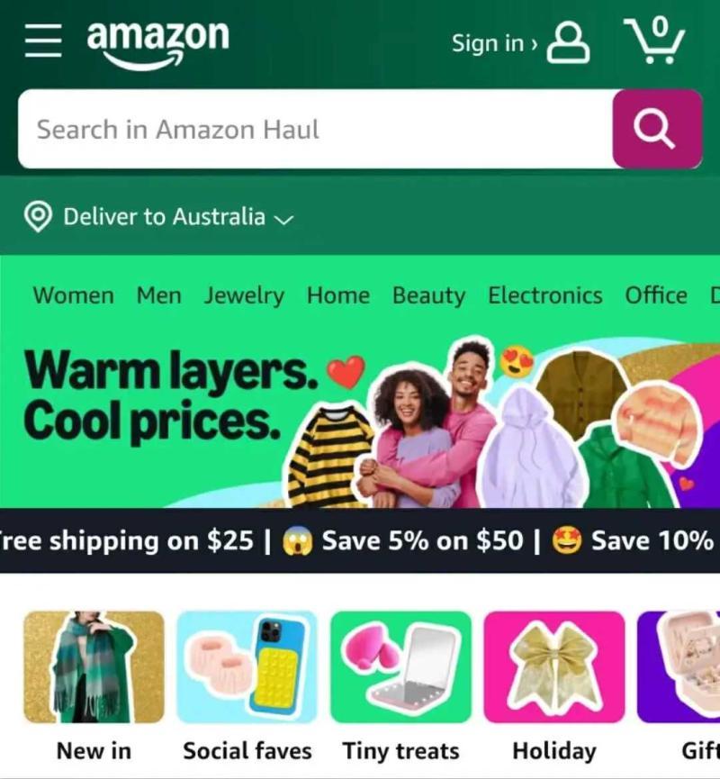 去年11月,亞馬遜低價商城在移動端正式上線。在亞馬遜APP上搜索“Haul”即可打開低價商城。低價商城首頁向消費者提供了多種優惠方案,包括25美元內免運費、50美元節省5%、75美元節省10%等。同時,為契合消費者的購物習慣,亞馬遜低價商城還設置了“新品推薦、節日用品、禮物、熱門產品”等7個專區版塊,以提高消費者的購物體驗。