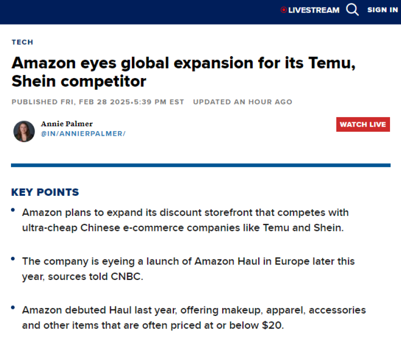 據兩位知情人士透露,亞馬遜打算今年晚些時候在歐洲推出Amazon Haul低價商城,由于計劃屬于機密,兩位知情人士不愿透露姓名。亞馬遜的一位發言人在一份聲明中表示:我們一直在探索與銷售伙伴合作的新方式,以更多的選擇、更低的價格和更大的便利取悅世界各地的客戶。