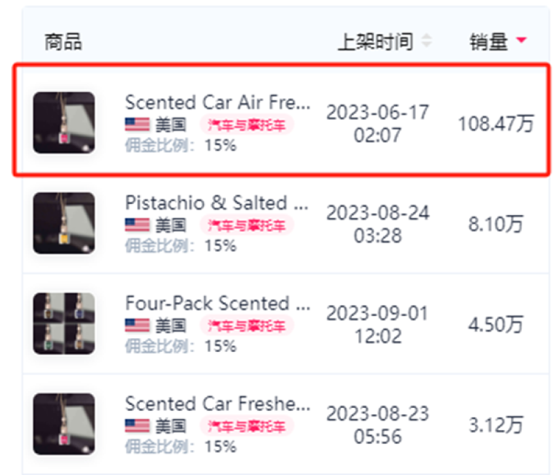 以TikTok為例,在TikTok美區銷量榜前十中,來自CE Craft小店和Mavwicks Fragrances LLC小店的四款香薰產品就占據了第二、第三、第四以及第七的位置。其中,Ce Craft Company車載香薰自上架以來就是TikTok熱銷榜單的常客,截至目前,該產品的銷量已達到108.47萬件。