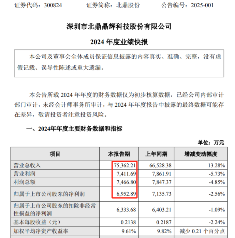 近日,北鼎股份發布了2024年全年業績快報,數據顯示,公司在過去一年中實現了營業總收入7.54億元,較去年同期增長13.28%,凈利潤為6952.89萬元,較去年同期下滑2.56%。其中,海外市場成為其營收的最大亮點,達到6384.32萬元,同比增加95.49%。