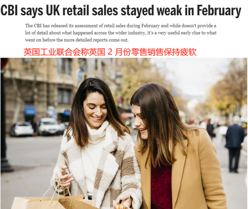 事實上,經濟下行的迷霧早已籠罩在英國市場上空,消費降級完全是意料之中。前不久,英國工業(yè)聯(lián)合會(CBI)發(fā)布了對2月份零售額的評估數據,數據指出,2月份英國零售銷售額依舊處于疲軟態(tài)勢。而隨著零售銷售持續(xù)疲軟,英國零售商的悲觀情緒依然存在,預計今年3月份銷售額會繼續(xù)下滑。