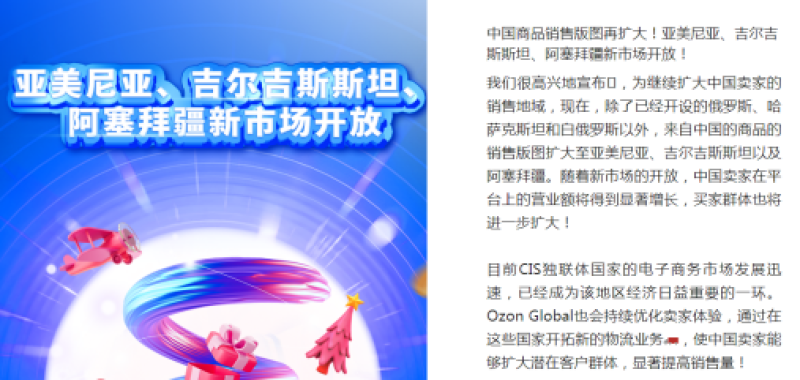 去年底,俄羅斯電商巨頭Wildberries發布公告,全面開放中國賣家入駐。今年初,另一大俄羅斯電商平臺Ozon宣布,擴大中國賣家的銷售范圍,開放亞美尼亞、吉爾吉斯斯坦和阿塞拜疆站點。同時,從今年2月11日起,所有入駐Ozon平臺的新賣家都將免收保證金。