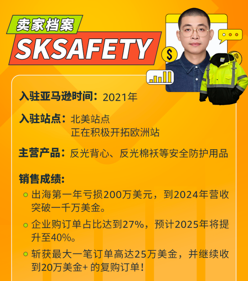 這個品牌就是亞馬遜大賣SKSAFETY,主營反光背心、反光棉襖等安全防護用品。據了解,SKSAFETY由于對海外需求洞察不明晰,在出海第一年就虧損了200萬美金。好在,SKSAFETY及時調整出海策略,到2024年營收順利突破了一千萬美金大關。