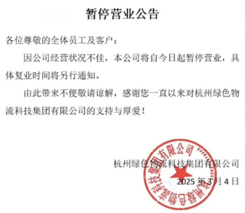 最近,杭州綠色物流科技集團有限公司(以下簡稱“綠色物流”)發布暫停營業公告,公告中寫道,“因公司經營狀況不佳,本公司將從3月4日起暫停營業,具體復業時間將另行通知”。?