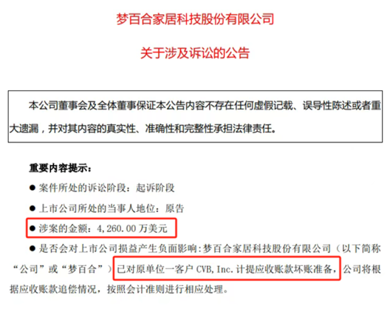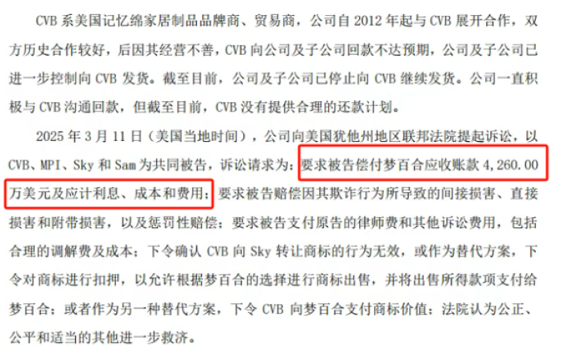 公告顯示,夢(mèng)百合作為原告,已于2025年3月11日向美國(guó)猶他州地區(qū)聯(lián)邦提起訴訟,指控美國(guó)公司CVB,Inc拖欠4260萬(wàn)美元(約合人民幣3.1億元)。并且,夢(mèng)百合已對(duì)被告公司計(jì)提應(yīng)收賬款壞款準(zhǔn)備。