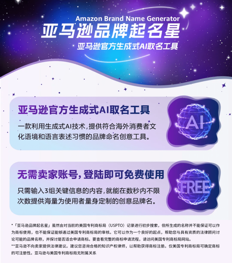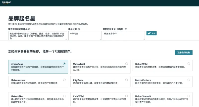 具體使用層面,用戶只需填寫產(chǎn)品、品類、目標(biāo)受眾和所需的品牌個(gè)性,亞馬遜品牌起名星就能提供一系列的品牌名稱創(chuàng)意。這些品牌創(chuàng)意,是對美國專利商標(biāo)局(USPTO)記錄進(jìn)行初步搜索之后的結(jié)果,為進(jìn)一步申請和注冊商標(biāo)提供了良好的基礎(chǔ),同時(shí)規(guī)避了打造品牌名稱上可能會(huì)遇到的問題。