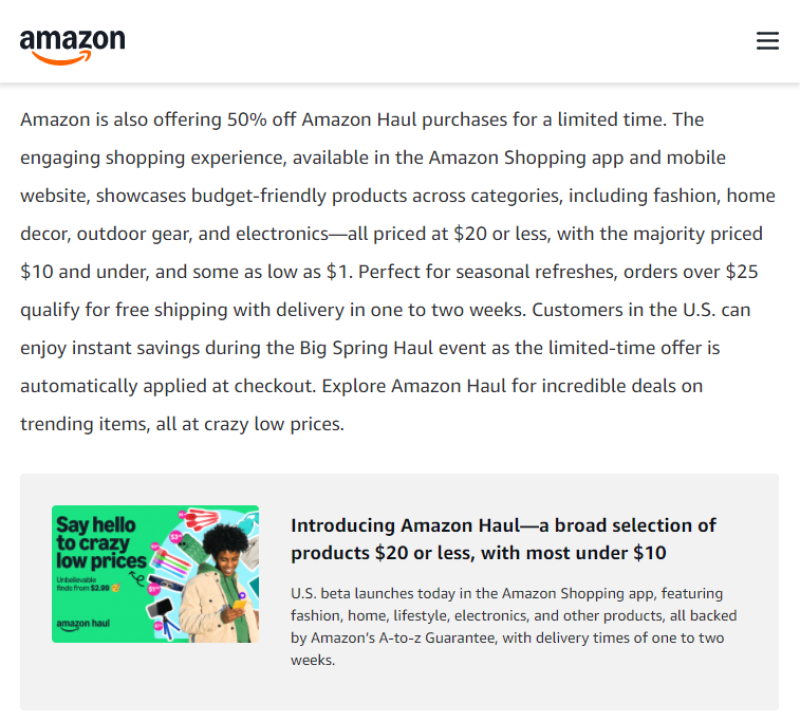這次大促期間,亞馬遜將特別重點推廣低價平臺Amazon Haul,消費者在大促期間購買該平臺商品可享受50%折扣。該平臺于去年11月上線,僅通過移動端提供服務,所有商品定價不超過20美元,其中大多數商品低于10美元,部分甚至低至1美元,涵蓋家居裝飾、時尚配飾、戶外裝備和電子產品等類別。訂單滿25美元可享受1-2周內的免費送貨服務。盡管目前Amazon Haul在美國市場的滲透率仍低于Temu,但亞馬遜表示對該平臺的市場表現感到滿意,并希望通過此次促銷吸引更多用戶。