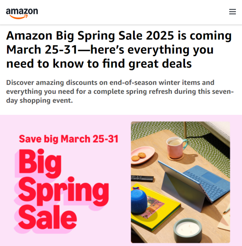 3月20日消息,亞馬遜年度“春季大促”(Big Spring Sale)將于3月25日正式啟動,將持續至3月31日。今年的促銷活動面向所有消費者,但Prime會員將享受額外折扣。此次大促涵蓋35多個品類,提供最高40%的折扣,涉及服裝、美妝、戶外家具和園藝用品等熱門商品。大促期間還將清理冬季和春季尾貨,包括服飾、美妝、運動、旅行用品等,部分商品最高可享40%折扣,庭院燒烤設備、家居收納及床上用品等商品折扣最高達35%。
