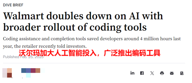除了開發(fā)賣家端AI助手,在沃爾瑪內(nèi)部,致力于提升運營效率的AI工具也正被廣泛推行。今年初,沃爾瑪首席執(zhí)行官Doug McMillon就表示,“在人工智能項目取得初步成功后,我們計劃推廣更多人工智能編碼工具,提高大家的工作效率。”