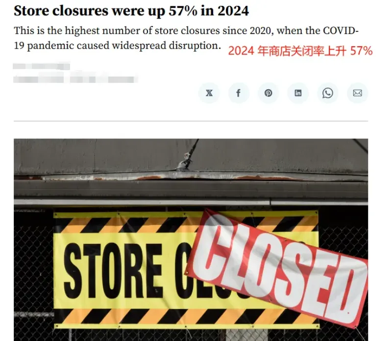 根據Coresight Research的數據,2024年全美約有7327家零售店關門,比2023年增長了57.8%。這是自2020年以來,商店關閉數量最多的一年。與此同時,關閉的門店數量甚至遠多于新開的門店數量,2024年新開門店數量僅小幅增長8.2%,為5919家。