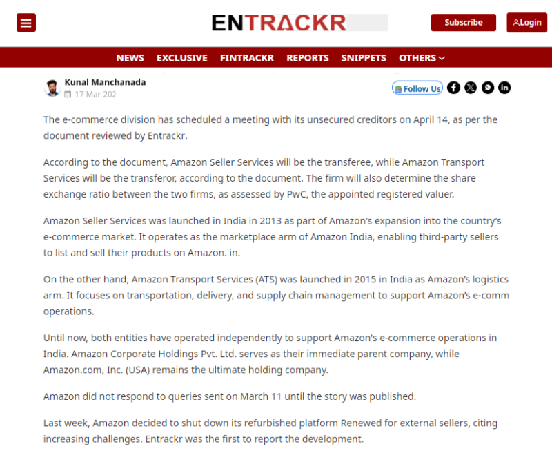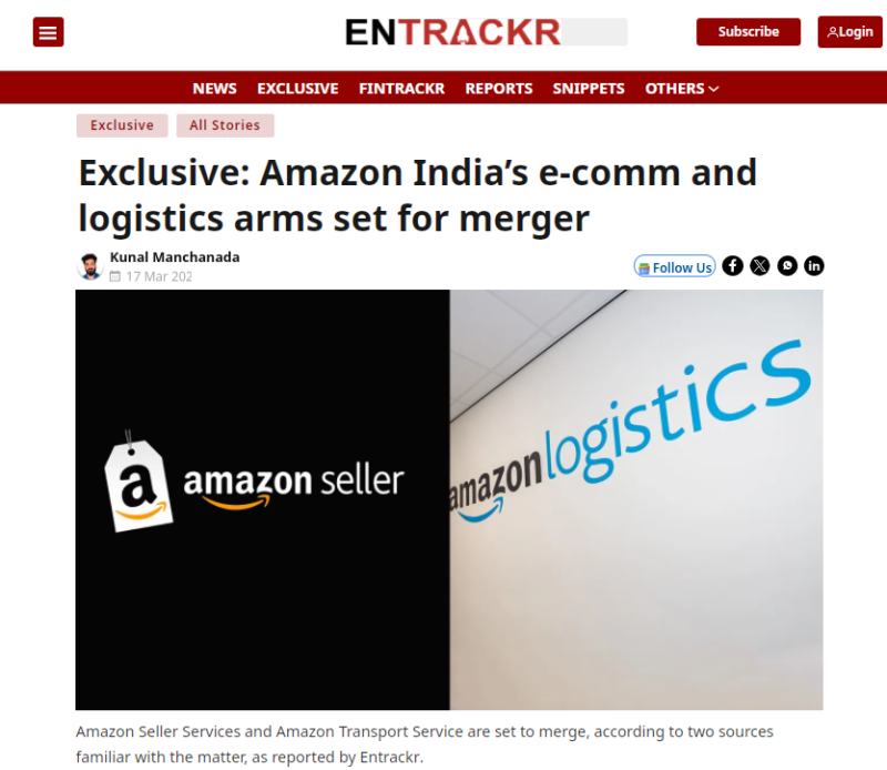 亞馬遜賣家服務于2013年進入印度市場,是亞馬遜印度的電商平臺,為第三方賣家提供商品銷售渠道。亞馬遜運輸服務(ATS)成立于2015年,專注于物流、配送和供應鏈管理,支持亞馬遜在印度的電商業務。盡管兩者此前一直獨立運營,但均隸屬于新加坡的母公司Amazon Corporate Holdings,最終母公司為美國亞馬遜。