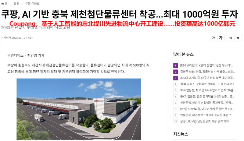 近日,Coupang宣布一項新物流建設項目,將在忠清北道堤川市新建一家基于人工智能技術的先進物流中心。預計該物流中心將于2026年6月竣工,占地面積約5.3萬平方米,總投資額達1000億韓元。