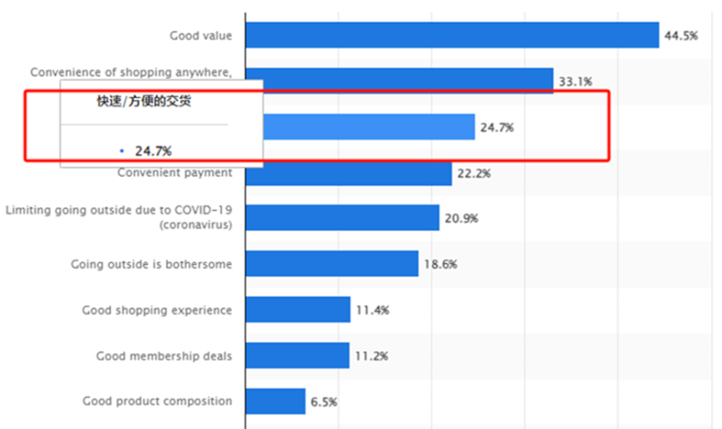 來自Statista的一項調查報告顯示,24.7%的韓國消費者將快速便利的配送服務視為第三大網購考慮因素,這一比例僅次于商品性價比優勢(44.5%)和整體購物體驗(33.1%)。FedEx的調查則顯示出更大的關聯性,50%的韓國消費者表示交貨時間會對他們的購物決策產生決定性影響。