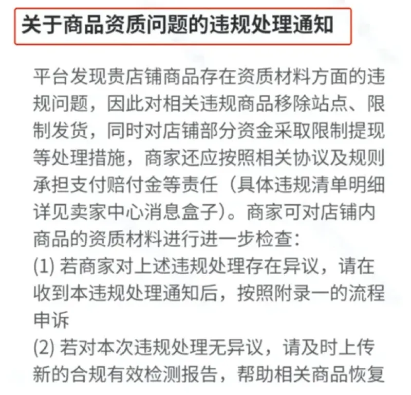 當然,在這一點上,多家電商巨頭都在不斷行動。去年年底,一批Temu賣家收到平臺發出的資金受限通知:“平臺發現貴店鋪商品存在資質材料方面的違規問題,因此對相關違規商品移除站點、限制發貨,同時對店鋪部分資金采取限制提現等處理措施。”