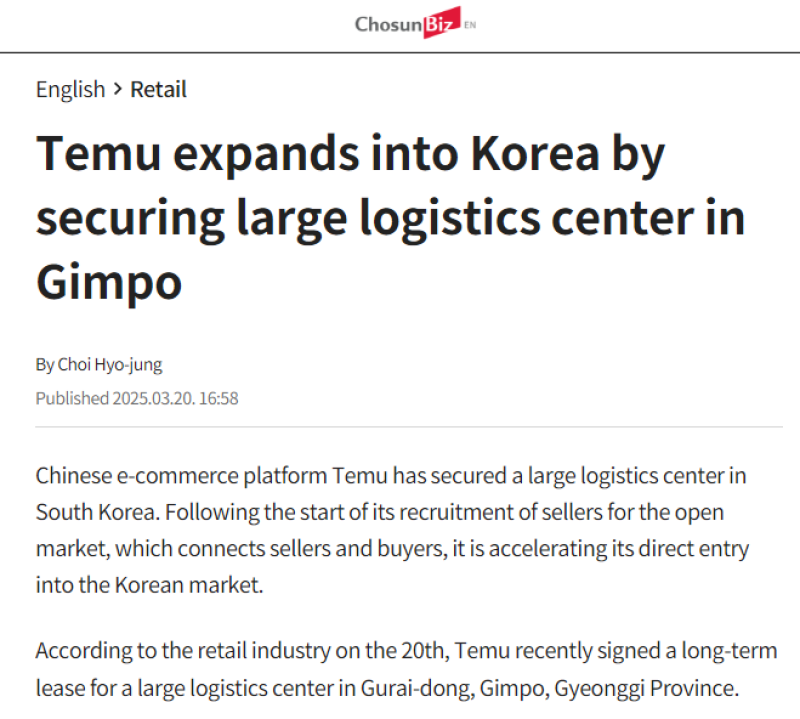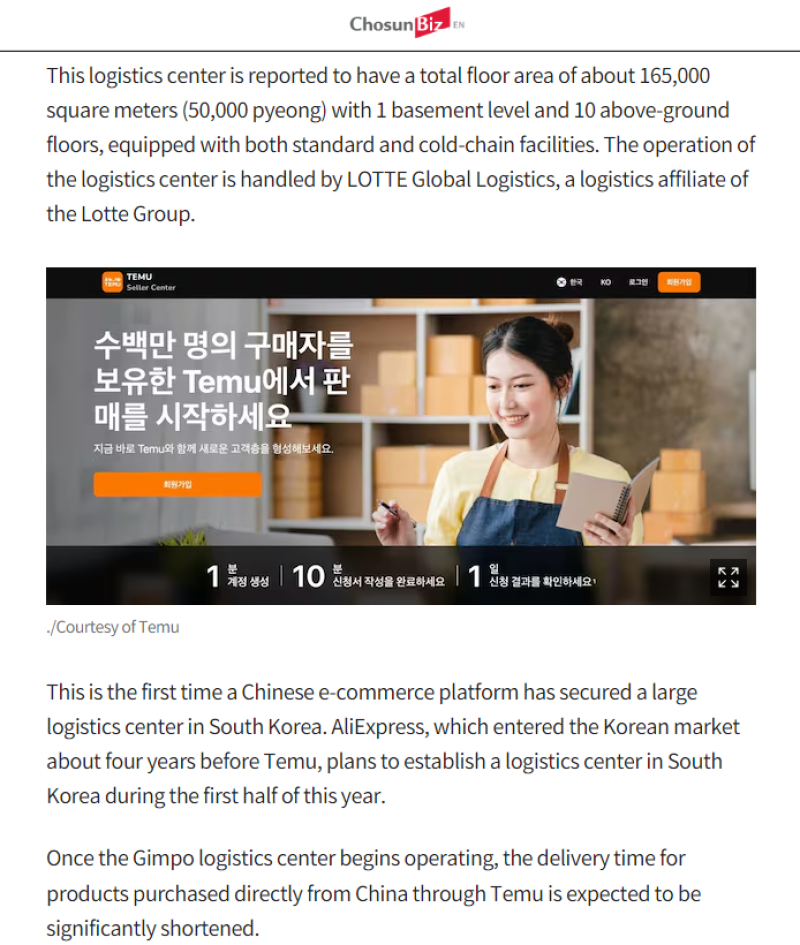 TEMU還在考慮將該中心作為韓國(guó)總部所在地,隨著該物流中心的投入使用,通過(guò)TEMU購(gòu)買的中國(guó)直購(gòu)商品配送時(shí)間有望大幅縮短,從而提升消費(fèi)者的購(gòu)物體驗(yàn)。