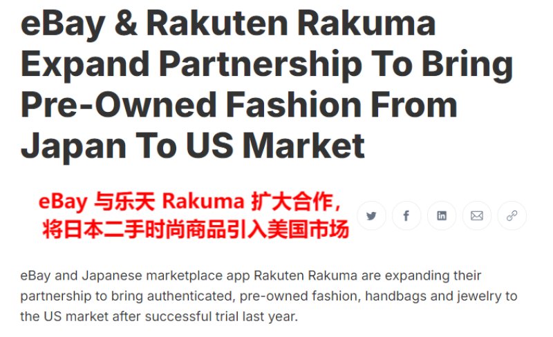 今年2月,日本二手電商Rakuma宣布與eBay擴大合作,全面開啟跨境二手交易,將Rakuma的二手時尚商品,包括服裝、珠寶、手提包等引入美國市場,拓展Rakuma品牌賣家的銷售渠道,同時擴大eBay平臺的商品種類。