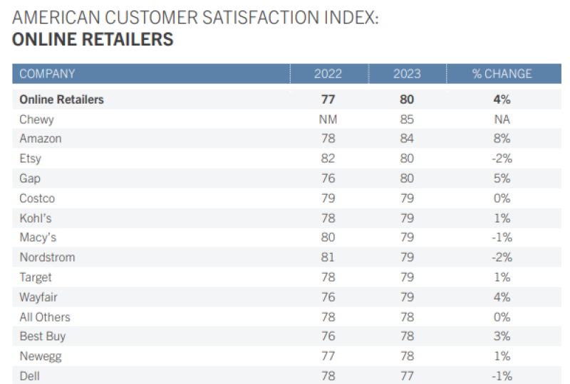 詳細來看,排名第二的亞馬遜表現也是一如既往地穩定,得分為83分,而eBay則以81分位列第三,相比上一年成績未有變化。緊隨其后的則是Kohl’s(79分)、Costco(79分,下降2%)、Etsy(79分,下降1%)和Home Depot(79分,上升3%)。