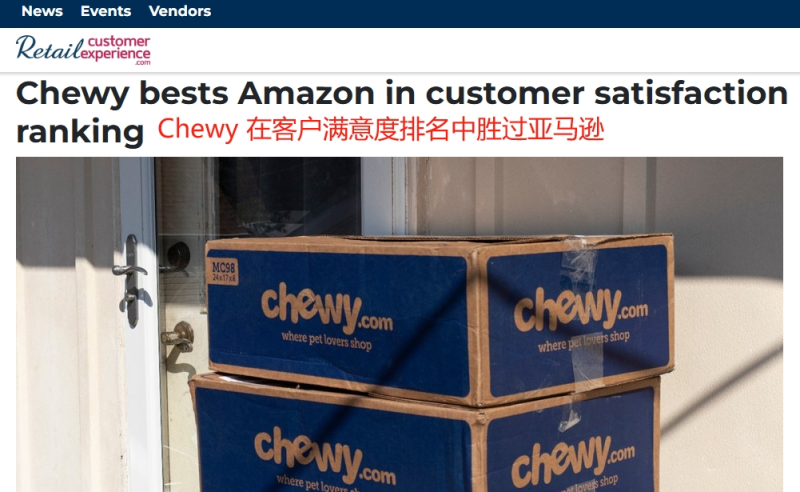 日前,發布了最新的美國顧客滿意度指數,在這份報告中,寵物電商平臺Chewy以85分的成績再次位居在線零售商榜首,超越亞馬遜,連續三年保持領先。