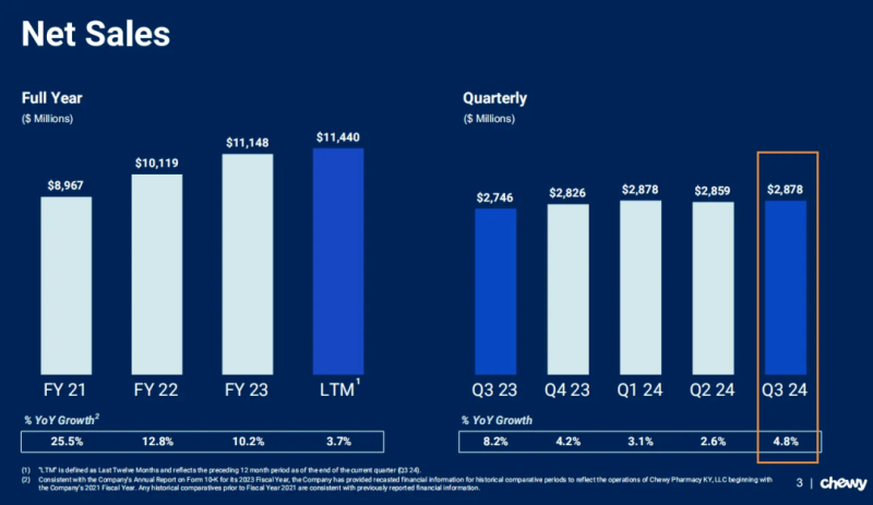 大家都知道,近兩年全球寵物市場發展很好,而作為全球知名寵物電商平臺,Chewy的發展也相當不錯,光是去年前三個季度,Chewy累計凈銷售額就達到86.14億美元(約626.35億人民幣),同比增長3.51%。