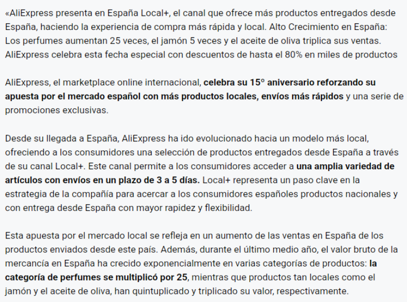 3月25日消息,作為西班牙最重要的電商平臺之一,速賣通在迎來15周年慶之際,通過增加本土商品、提速物流時效、推出專屬促銷活動等方式加碼西班牙市場布局。3月17日-24日周年慶活動期間,速賣通在西班牙推出Local+頻道,提供更多本土發(fā)貨商品,確保3-5日內(nèi)送達(dá),為消費者打造更快速、地道的購物體驗。同時,平臺上的數(shù)千種產(chǎn)品提供高達(dá)80%的折扣。