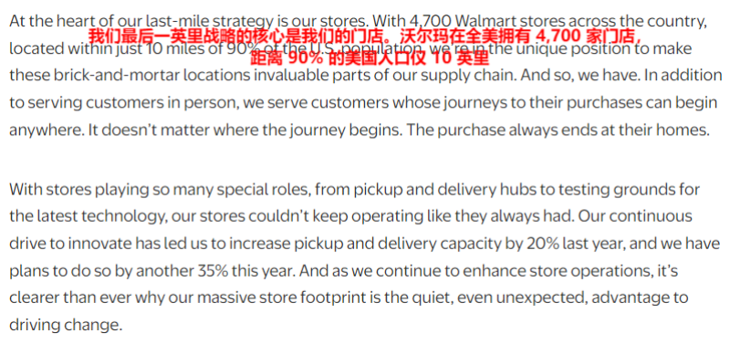 此外,沃爾瑪作為零售巨頭,其龐大的線下零售網絡也是重要的物流樞紐,這些實體店充當了小型配送中心,不僅加快最后一英里配送,而且有效降低運輸成本。這也是沃爾瑪電商與亞馬遜相比,最具優勢的一大領域。