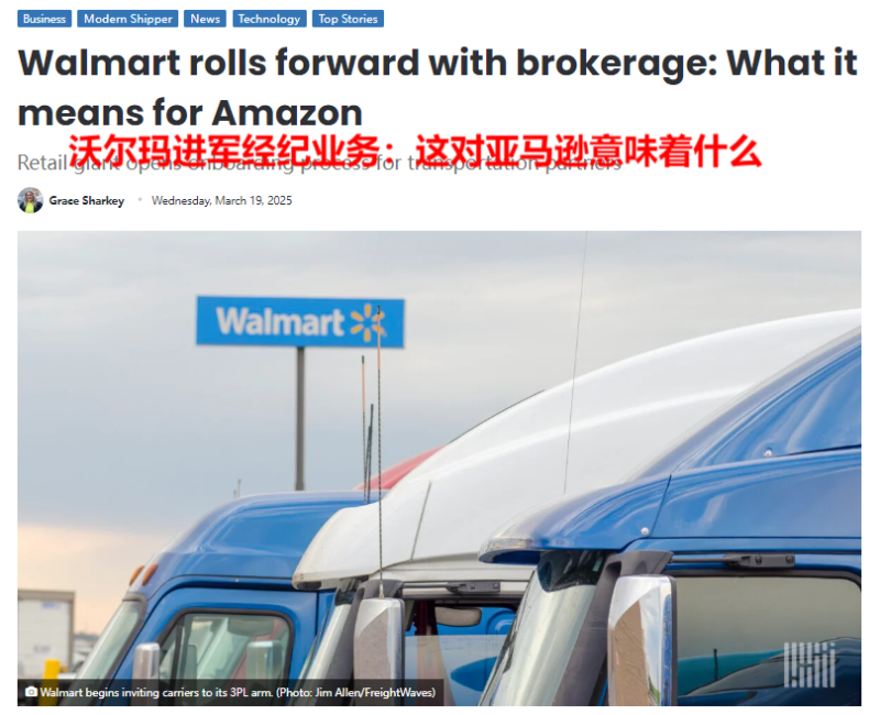近日,美國貨運服務商FreightWaves透露,沃爾瑪正在給部分承運商發送郵件,邀請他們加入沃爾瑪現有的物流網絡,為沃爾瑪賣家提供貨運服務。