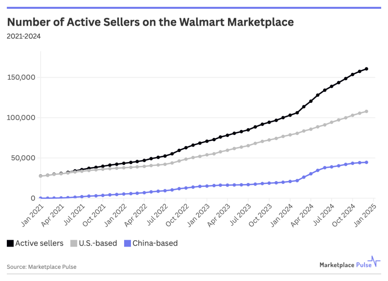 與此同時,沃爾瑪賣家規模也在穩步擴張。市場情報機構Marketplace Pulse的數據顯示,截至去年底,沃爾瑪活躍賣家數量突破15萬。其中,作為跨境電商領域的核心力量,中國新賣家占比41%,中國活躍賣家占比28%。