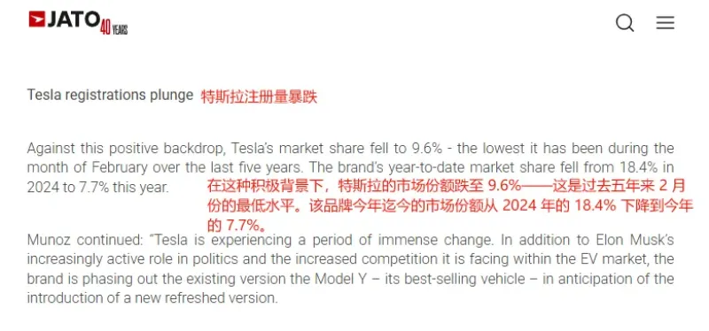 特斯拉市場份額下降 圖源:JATO Dynamics