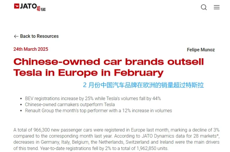 市場研究機構JATO Dynamics最新調查顯示,今年2月,中國電動汽車品牌在歐洲注冊了19800輛,超過了特斯拉的15700輛。而在去年同期,中國電動汽車品牌注冊了23182輛,特斯拉注冊了28131輛。