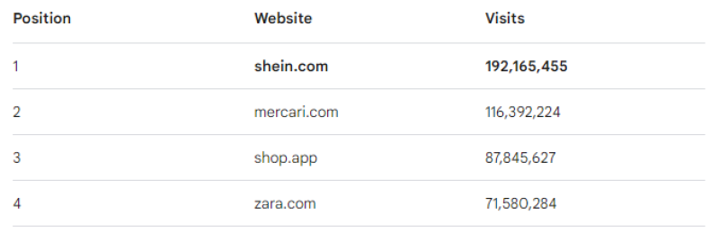 比如時尚電商巨頭Shein。根據在線分析平臺Semrush的數據,今年1月,Shein是全球訪問量最大的服裝時尚購物網站,其直接流量占比超過63%。