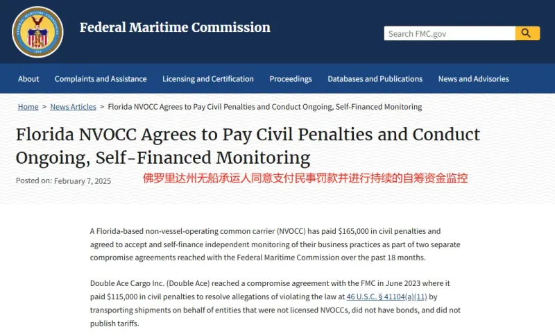 實際上,Double Ace早在2023年6月就支付過11.5萬美元的民事罰款,以解決其代表未經許可的無船承運人、沒有保證金且未公布關稅的實體運輸貨物的指控;之后又在2024年初支付5萬美元民事罰款,除了支付罰款外,Double Ace還同意接受并支付獨立監察員的費用。