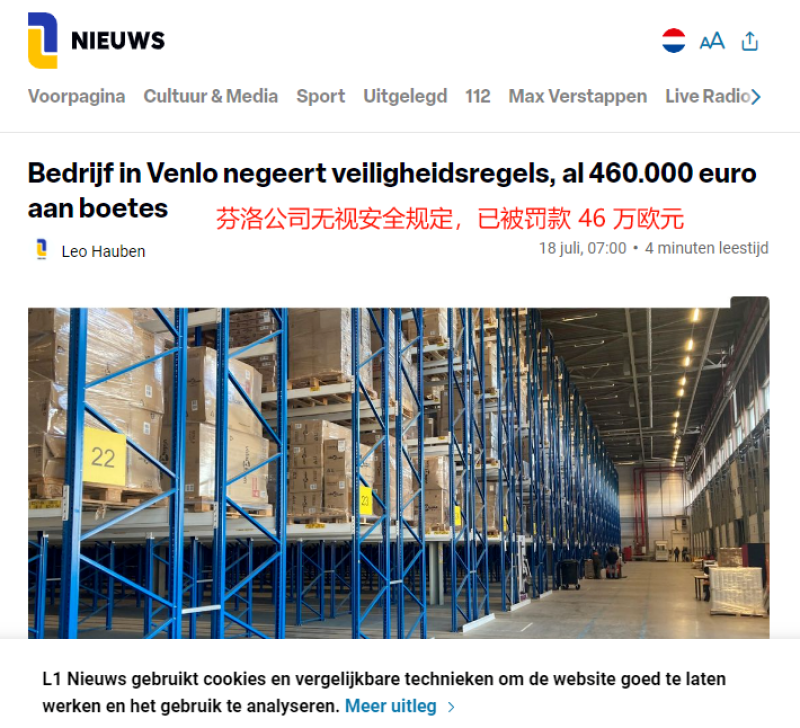 2023年3月,歐洲知名物流企業Broekman Logistics位于荷蘭芬洛的分公司被曝出違規存放電池類商品,然而過了5個月該公司仍未做出任何實質性改善,隨即被處以25萬歐元的罰款。