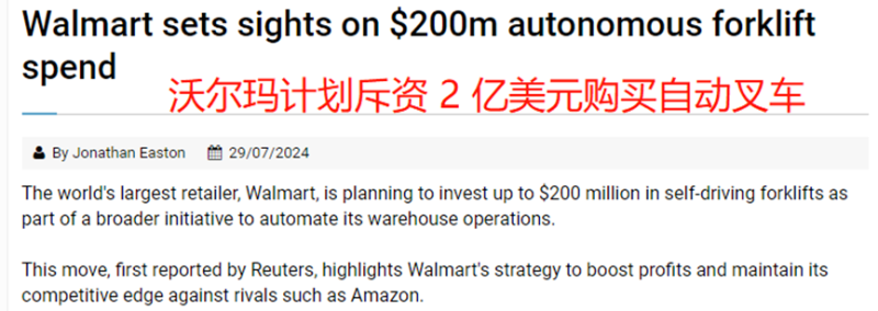 沃爾瑪計劃斥資2億美元購買自動叉車 圖源:retail-systems