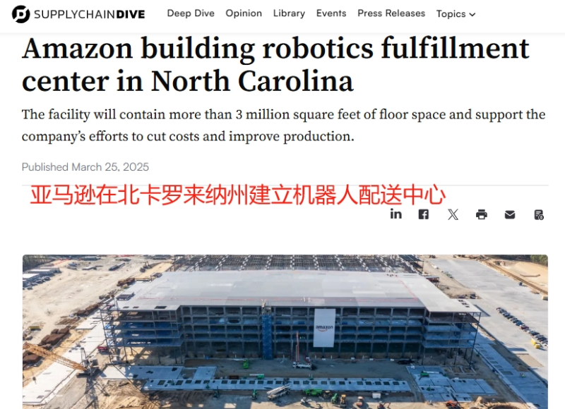 近日,亞馬遜宣布在美國北卡羅來納州的威爾明頓建設一座全新的機器人履約物流配送中心,計劃于2026年投入運營,旨在優(yōu)化履約的流程并降低運營成本。