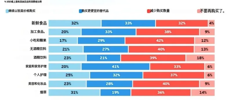 另外,面對不同產品類別的價格上漲,有41%的受訪者選擇價格較低的家居和家庭護理產品,17%的受訪者完全停止購買酒類,約41%的受訪者減少了零食和糖果的購買量。