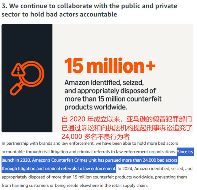 比如,通過對AI領(lǐng)域的持續(xù)投資,亞馬遜主動控制措施得到改進,在品牌發(fā)現(xiàn)和舉報之前就能屏蔽掉99%以上的疑似侵權(quán)產(chǎn)品。此外,亞馬遜堅持與品牌方和執(zhí)法機構(gòu)保持合作,通過民事訴訟和刑事轉(zhuǎn)介追究造假售假賣家的責任,自2020年亞馬遜假冒犯罪部門成立以來,已有超24000名不良賣家被起訴。