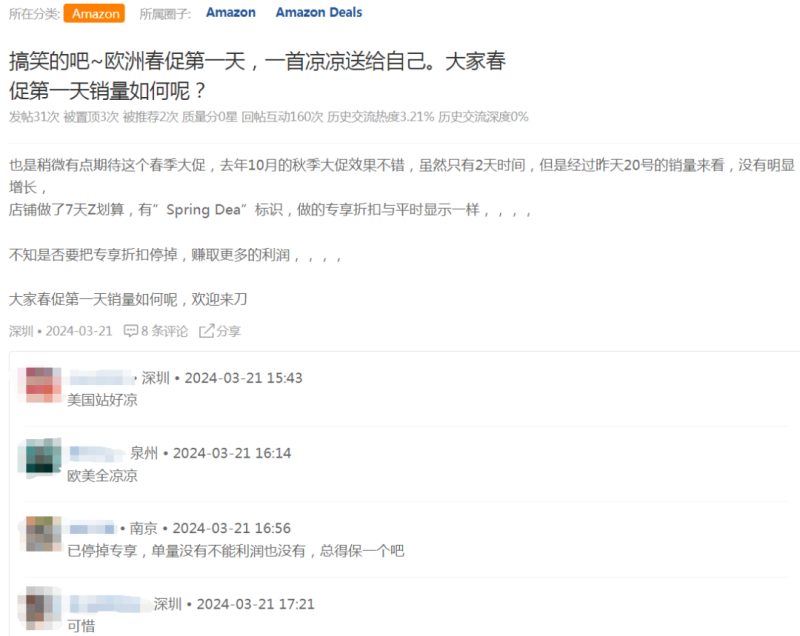 不過,在一片哀嚎聲中也有心態好的賣家,依然對這次的春季大促抱有期待。這部分賣家認為亞馬遜今年的春季大促造勢比較大,時間線拉得也很長,可能等到周末兩天單量就會慢慢上來。當然了,面對春促遇冷的情況,賣家們也不能坐以待斃,還是要積極尋找應對策略渡過難關,就算賺不到什么錢,也要把損失降到最低。