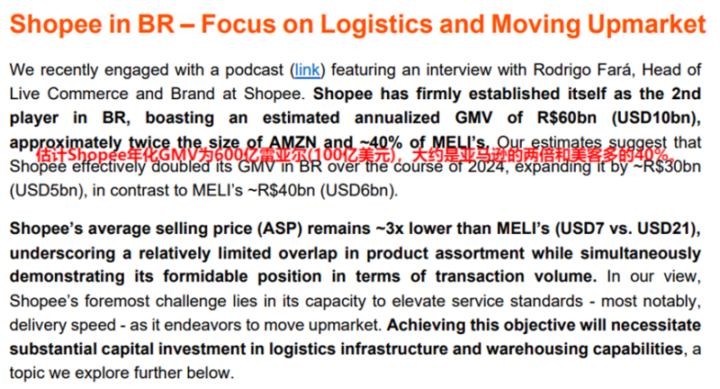 值得一提的是,市場(chǎng)地位的穩(wěn)固也帶動(dòng)Shopee銷(xiāo)售增長(zhǎng),Itaú BBA的研究報(bào)告指出,2024年,Shopee在巴西的銷(xiāo)售額實(shí)現(xiàn)翻倍增長(zhǎng),達(dá)到約600億雷亞爾(約合103億美元),是亞馬遜收入的兩倍,美客多巴西的40%。