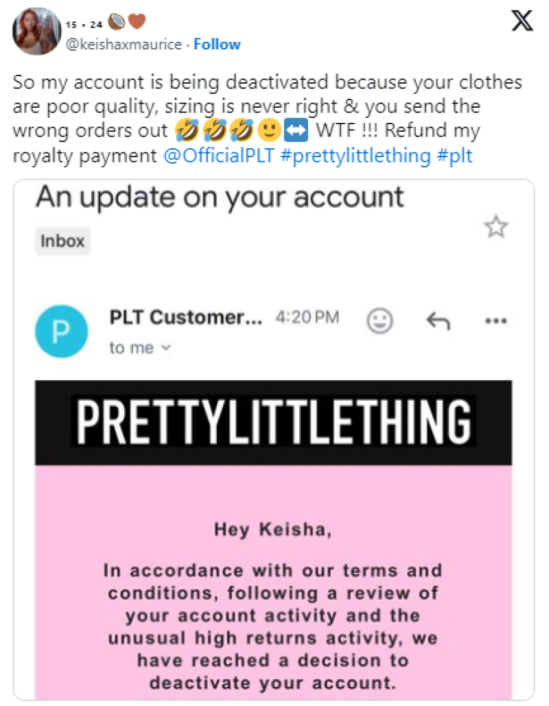 比如在線時尚平臺Asos,其選擇用退貨頻率為依據,針對不同顧客制定退貨政策。例如在英國市場,高退貨率顧客在退貨時,只有保留價值至少40英鎊的訂單,才能享受免費送貨服務,否則將被收取3.95英鎊的退貨費用。快時尚巨頭PrettyLittleThing則采取更加強硬的措施,直接停用部分高退貨率顧客的賬戶。
