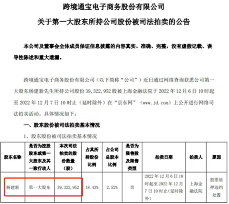 2020年,東證融匯證券資產管理有限公司就因跨境通遲遲未還債,將其訴諸法庭,2022年12月,鑒于跨境通未能償清欠款,上海金融法院以股票質押違約由,對跨境通第一大股東楊建新所持3932.2952萬股公司股份進行司法拍賣。