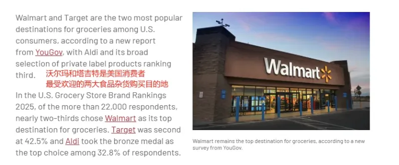 事實上,塔吉特在美國零售市場的實力一直都排得上號。YouGov最新的一份報告顯示,塔吉特以42.5%的市場份額,成為美國消費者購買食品雜貨的第二大熱門目的地,僅次于沃爾瑪(66.7%)。