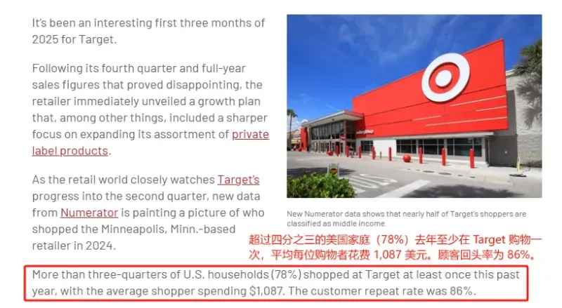 根據數據和技術公司Numerator的最新數據,2024年,78%的美國家庭至少在Target購物一次,平均每位顧客花費1087美元,并完成23次購買,客戶回頭率高達86%。