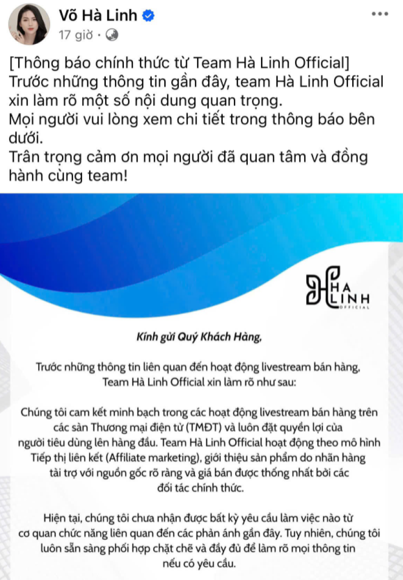 Vo Ha Linh的公開聲明 圖源:24h.com.vn